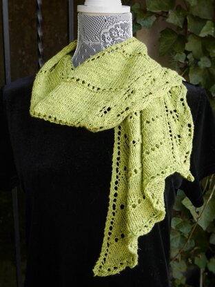 Linden Leaf is an asymmetric triangle scarf worked flat, from point to wide end. The lacy edge features a twin leaf pattern which is knit at the same time as the body of the scarf.