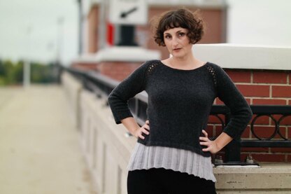 The pullover starts at the neck as a simple top-down raglan, but different rates of increase on the body and sleeves create a shape that curves around the shoulders. The raglan lines are decorated with a narrow lace pattern that resembles interlocking chains. The cropped body of the sweater features a skirt worked in a coordinating lace weight yarn and wide rib to mimic pleats.