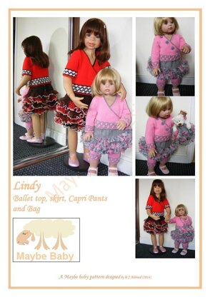 The set comprises of a cross over ballet style top with short or long sleeves, a skirt full of ruffles, a small dolly bag, and Capri pants for the smaller sizes.