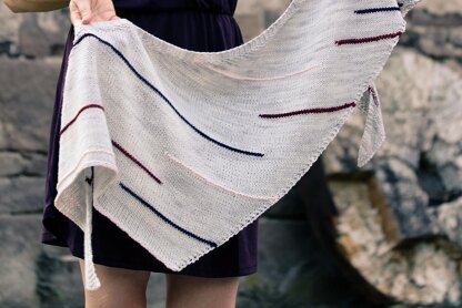 Contrasting garter lines accent the clean stockinette canvas of this sideways swoop shawl. Choose bold monotones or a rainbow of colored leftovers to create your art; the elongated bias shape suits men or women, and can be made to any size.