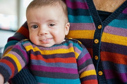 LINEUP: A collection of sweaters for newborns to adults, knit in stunning colored stripes. The collection includes a pullover with a buttoned boat collar for babies, a pullover with a faux turtleneck for kids, a pullover with a faux turtleneck for adults and a cardigan for adults.