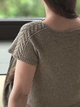 The Linnea Tee is a cropped and short sleeved tee which is worked seamlessly in the round, from top to bottom, with a lace panel on the sleeves. It starts with the neck and simple 1x1 ribbing, followed by a raglan increase for the body and sleeves, while working the lace panel on the sleeves. After dividing body and sleeves, the body is worked in stockinette and ends with a 1x1 ribbing at the end. There are no shaping decreases and increases along the sides of the body. It is intended to be worn with approx. 15 cm / 6” positive ease around the chest. Sample shown in size B on a 86 cm bust.