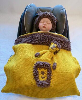 A fun pattern to knit. The Lion baby car seat blanket has a matching hat, feature pocket and toy. Suitable for a baby aged between 3-12 months. A unique blanket design which is secured in the car seat by the straps. It would make the perfect baby shower gift!