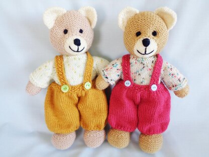 Billy is a 12 inch (31 cms) bear knitted in DK yarn in reverse stocking stitch. Jumper and play overalls are also in DK yarn and are removable.