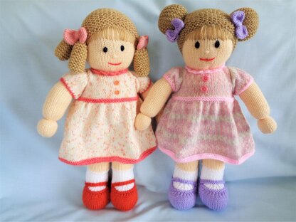 Veronica is a 17 inch (43 cms) doll knitted in DK yarn. Hair is knitted in garter stitch and sewn in place. There is a choice of two hairstyles, ringlets or two buns. Dress is knitted in 4ply yarn and is removable.