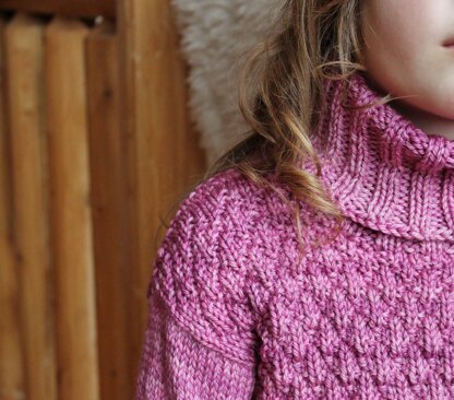 Sweater is cast on and worked in the round up to the armholes, where work is split and worked flat. Shoulders are rejoined using a 3 needle bind off, sleeves & turtleneck are picked up & knit in the round.