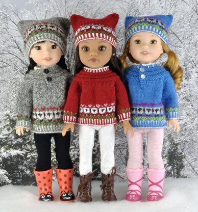 PATTERN DETAILS:This is a knitting pattern for a stranded fair isle pullover sweater and matching hat to fit a 14 to 14.5 inch doll similar to WellieWishers® Ruby Red and Hearts for Hearts™ dolls. The sweater has a buttoned placket opening that can be worn at the front or the back. The body, sleeves and hat are knitted bottom up, in the round using stranded fair isle technique. Body and sleeves are knit separately to underarm then joined for the yoke. A placket opening is created at the back, beginning at the start of the yoke. The cuffs, hat band and hem of the sweater are knit in 2-color corrugated rib. The hat is closed at the top using either the 3-needle bind off or your preferred method of seaming. The pattern PDF includes photos, written instructions and charts for the fair isle design.