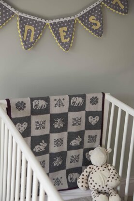 The cot blanket is composed of patchwork squares in two alternating colourways of either Rowan Wool Cotton 4ply or Summerlite 4ply, bordered with edging in a contrasting colour of the same yarn.