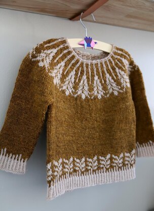 This cutie of a sweater is kids’ version of Grain. It’s a relaxed round yoke design with a wheat-inspired colorwork, and long sleeves. The neckline has corrugated ribbing while the hem and cuff ribbings are worked with the contrast colour.