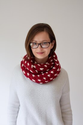 The Little Hearts Infinity is worked flat in a simple colorwork design. It is finished by grafting the ends together with Kitchener stitch for a seamless join. The pattern includes full written, charted and video instruction.