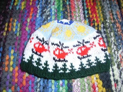 The beanie starts with a green forest and Hubby the little helicopter is flying above it. Bigger versions also have a tiny cloud pattern. The smaller versions just have the blue sky with the sun. At the top is a little star.