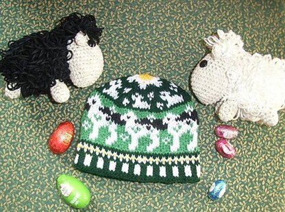 The beanie has a two color ribbing, a little daisy border pattern, lambs all around and some kneeing lambs, and a big daisy flower at the top.