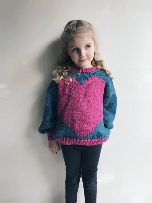 A knitting pattern for a relaxed fitting, drop-shoulder pullover with no waist shaping. It features a big love heart that is created using the intarsia technique. The contrast ribbing gives the sweater a fun retro vibe. Made using chunky yarn, it is a quick knit and a cosy winter garment. It is worked flat in panels and seamed. The neckline stitches are picked up and worked in the round.