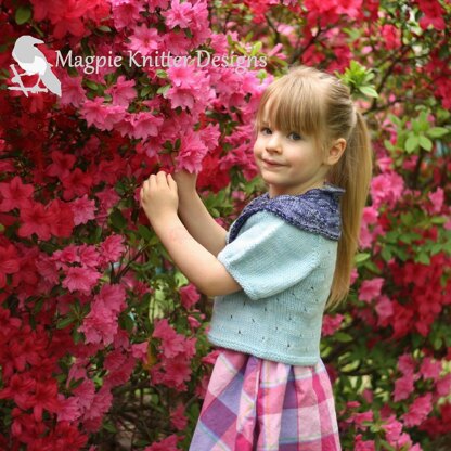 The inspiration: what would a little girl wear for a summer evening picnic in Monet's gardens in Giverney? This cropped swing cardigan has modernized details that evoke the lacy collars, simple lines, and Swiss dot fabric from the 1900's. Little Miss Mopsey is worked seamlessly from the top down with set in sleeves. The body is knit with Traveller, and the collar with Bugga! The back is knit first from a provisional cast-on, with short rows to give the shoulder a natural slope, to the end of the armholes. The front is worked from the cast-on and is knit to the same level as the back. At the bottom of the armholes the fronts are joined to the back with stitches cast on under the arm; the body is knit to the bottom. Sleeve stitches are picked up around the armhole, with the sleeve cap shaped by short rows, and the sleeve is knit in the round to the end. Stitches are picked up just inside the neck with Bugga! to knit the lace collar.