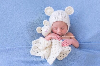 My idea for this little mouse lovey was created something new with a vintage feel. The classic granny square, the soft fuzzy yarn and the new, yet vintage looking fabric that I used for the accents were just the perfect combination.