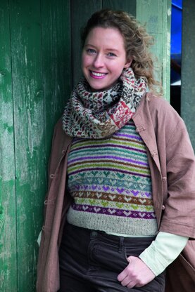 This longer length Fairisle cowl (from Martin’s More Easy Fairisle Knits) is knitted in four colours of Rowan Felted Tweed. It features rows of little owls in 3 different colourways and a striped leaf pattern in the same colourways. It has only two colours in a row.