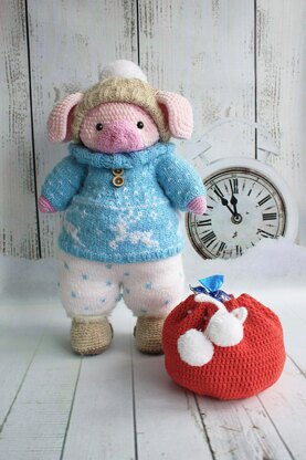 Hello dear crochet lovers! Puhlia is 35 cm / 13.7 inches tall from the paws to the top. He cannot sit, but it is possible to stand with some support. The tension and yarn may differ so the size of the toy may vary too. This toy is completely safe for kids because it does not have sharp objects. All clothes are removable and it is worked with both a crochet hook and knitting needles. The set of clothes consists of a mohair, warm sweater, winter pants, “valenki” or winter boots made of natural materials and a pom pom hat. Also, it has a big bag where you can hide all your gifts!