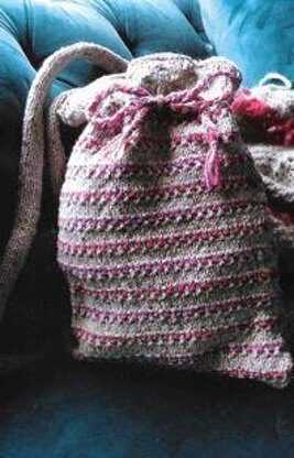 Thisi is a pattern for a little sheaf bag, originally published in Knitting magazine. It has a textured stripe stitch forming small knots, and a knot stitch top border. The strap is in stocking stitch. It is lined, and fastened with a plaited tie through eyelets. Photos Knitting magazine.