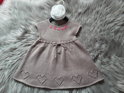 I made this dress for a newborn girl. My model is 3 months old but it will fit the baby up to 6 months. The measurements of the dress are: chest circumference 44 cm, length 38 cm, width at the bottom 100 cm. The size can be adjusted by casting on more stitches and working more rows.