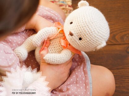 Finished crochet bear toy size is about 21-24 cm (8,2-9,4 inches).