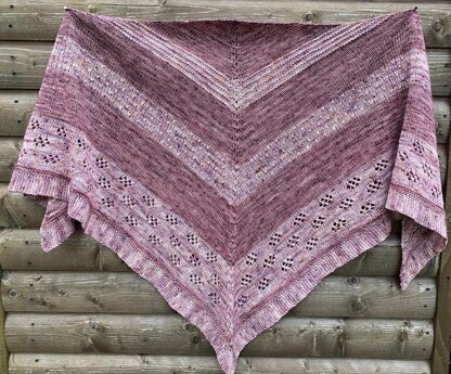 Little Tranquility Shawl is a triangular shawl, knit in two complimentary colours. Stocking stitch alternates with three different stitch patterns to keep the knitter’s interest, and a central mock cable runs down the centre of the shawl.