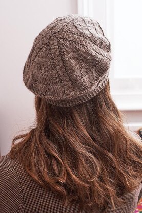 The classic beret shape of this adorable hat is offset by triangular panels and neatly twisting, braided cables. Worked in a busy yarn, these details are a surprise upon closer inspection: knit this hat in a more subtle semi-solid for a classic look.