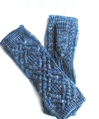 This is a pattern for fingerless mitts. They measure approximately 4- 5 inches from your thumb up your arm. They feature cable stitch patterns on both sides of the mitts, with a ribbing center for shaping. (The stitches are both charted and written out ‘line by line“. )The mitts also have a thumb gusset to insure the best fit, and allow you to type or text and keep warm at the same time. One size fits most, as a result of the lateral give, but there are tips for changing the size within each pattern. These mitts are made using two circular needles, and a heavy weight sock yarn, sport weight yarn