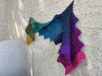 Designed for 24 or 25 mini skeins, there are options for both 10g/40yds and 20g/80yds. The pictured scarf uses 25 x 10g minis and is approx. 60" tip-to-tip and 15" at the wide end. The 20g mini version to make a shawl is estimated to end up 65" long and 28" at the wide end.