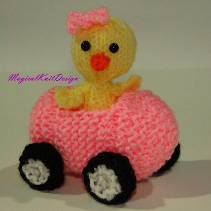 This is Lola on her egg-shaped car, knitted flat with straight Knitting needles, easy to follow pattern, with row by row written instructions and photo-tutorial.