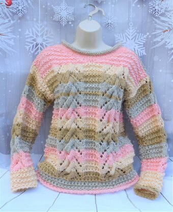Materials: Ice Design wool worsted pink, olive green, light yellow, Grey, Fibre content: 30% wool 70% acrylic, variegated (self-striping) wool. Straight Needle Size: 6.5 mm. / US 10 or size needed for gauge, circular needle size 6 mm for neck edge.