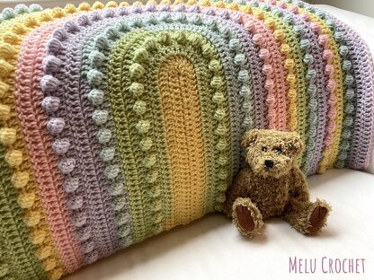 This gorgeous, bright lollipop rainbow blanket uses colour changing Lollipop yarn to create the beautiful rainbow effect. This pattern is really easy to work up, and there’s only a few ends to sew in once you’ve finished the project. There are two sizes of blanket you can choose to make. Pick the quick, smaller project (which uses just one cake) to make the perfect baby comforter for travelling out and about with. Or choose the larger size (which uses two cakes) for a lovely, bright receiving blanket. The bobbles add an attractive detail that’s also a tactile element for babies and children, and there are full instructions on how you make the bobbles provided in the pattern.
