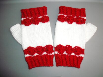 These frilly decorated fingerless gloves have a nice ribbed column for the cuff and upper edge and a well constructed thumb gusset.