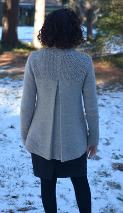 This cardigan features long, lean lines, and a dramatic center-back pleat. The body is worked in one piece from bottom up to the armholes. The pleat is knitted in and bound-off. Separate pieces are worked for the back yoke, collar, and sleeves. The sleeves are knit in the round and sewn into the armhole.