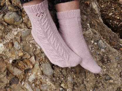 The Lonely Bloom Socks pattern features a single flower stem on one side of a sock, growing from toes to cuff. Socks are worked from toe up with distinctive directional left and right toes, small gusset, short row heels and asymmetric placement of the Bloom pattern. The pattern describes working the top/front and the sole/back of the foot/leg. Socks can be worked on double pointed needles, two circular needles or on other types of needles convenient for the knitter for knitting small circumference in the round. The stitch pattern is charted and written.