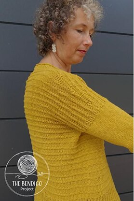 The jumper is worked bottom-up, in the round, starting with the 1/1 rib. After separating for sleeve holes, front and back are worked flat, with the sloped shoulders finished with a three needle bind off.