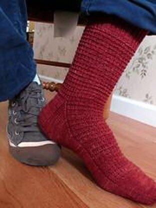 This top-down sock in six sizes features a universally appealing knit/purl motif which strikes a great balance between a subtle look and fun knitting that travels well; it also puts variegated yarns to great use. Sock is easily converted to toe-up construction. Substituting yarn and/or needles may result in an overall variation in size.