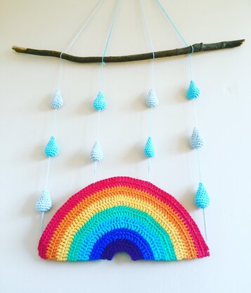 This crochet pattern is for a home decor / wall hanging. Approximate finished size if recommended yarn (Drops Paris) is used is Rainbow 19cm x 39cm, Raindrops 6cm x 4cm, total length of wall hanging approx 90-95cm.