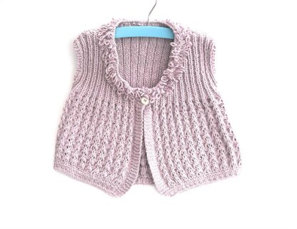 Pretty feminine textual lace top; ideal cotton waistcoat / cardi for the grown up girl. Loopy neckband gives it that fun quirkyness too. Simple shaping obtained by change of pattern. Full written instructions for lace and loops.