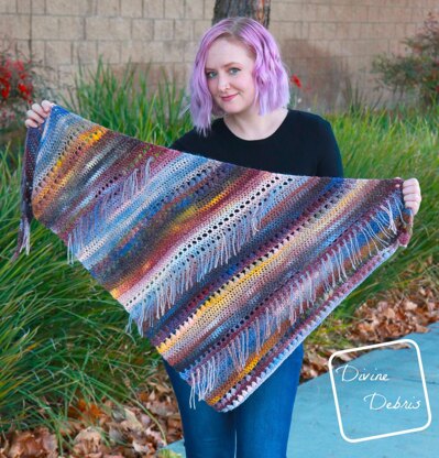 Shawls are wonderful, don’t you think? They work well to keep you cold when it’s getting a bit chilly outside but they also work well as a scarf, with a variety of ways of styling them. Don’t you just love it? And with the Loretta Shawl, you’ve got that great triangle shape coupled with texture and (optional) fun fringe. This design is available for free on DivineDebris[dot]com.