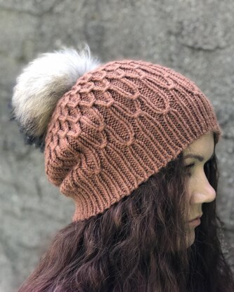 This slouchy beanie is worked bottom up with smocking stitches that wane in height, shortening toward the crown. Extra cozy and easy to wear. Worked with US7 circular needles. One size to fit average adult head circumference of 21"-23".