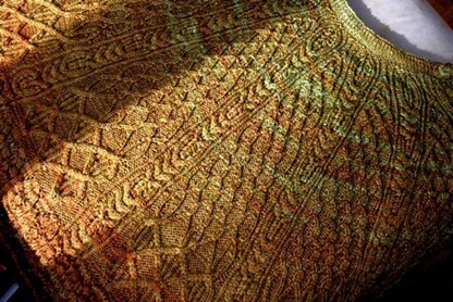 This stunning cabled cape's design flows organically from the trees of the Golden wood at the bottom of the cape into an intricate twisted stitch pattern, sure to grace the wearer.
