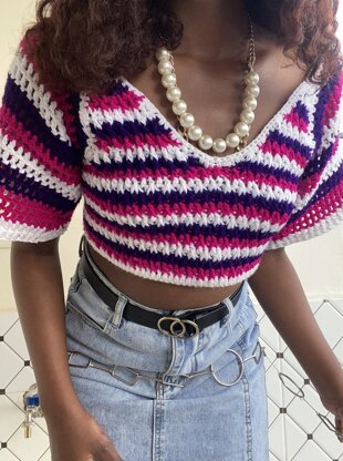 PATTERN NOTES The colors used are (Color 1) white, (Color 2) pink (Color 3) Dark Purple to create a splash of a pink-purplish flavors and colors. The pattern is available in size (XS, S, M, L) Other color combinations of your choice can be used for this project. The top is made in a rectangle then triangles for the busts area. Construction notes The yarn strands are doubled up to increase the yarn weight. The turning chain counts as a stitch and is the first st in the row. To make straight edges in a regular dc row, skip the very first st at the beginning of the row. To change colors; regular dc in each st across until the 2nd last stitch, in the last st yarn over, pull through, yarn over and pull through 2 loops and remain with two loops on your hook, switch to the other color, pull the other color through all the loops. With the other color, ch 2, turn. If you chose to sell the finished product, please credit Bobo Stitches as the designer