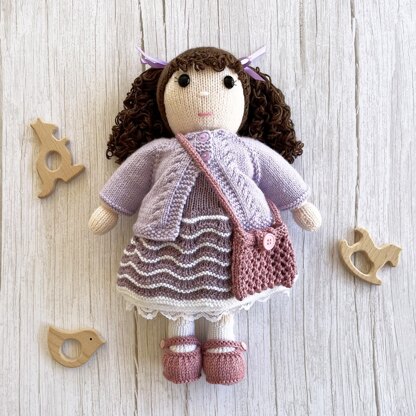 Louisa doll stands around 36cm (14 inches) tall and comes complete with the pattern for her dress, waist slip, panties, cardigan, shoes and shoulder bag.