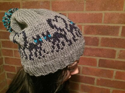 This cat themed hat has a ribbed welt and a stocking stitch body with a Fair Isle (stranded) cat repeat pattern encircling the lower section of the hat body; when paired together, the cats’ tails form the shape of a heart. The motifs are worked using only two colours in a row, with the exception of the cats’ eyes row, which makes this an ideal pattern for those new to the Fair Isle technique. The hats pictured are worked using a lovely soft merino wool in Aran weight and are topped with an optional pompom.