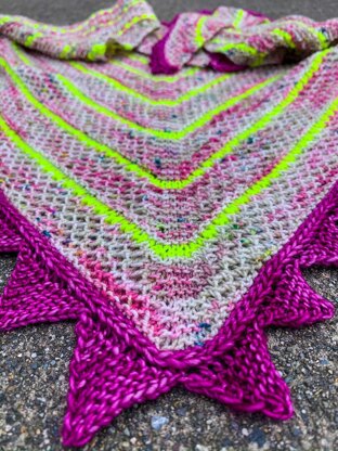 You’re going to love Love Frenzy! I knit mine 100% in front of the tv, so I guess you can say it’s good quarantine knitting. Squishy texture is fun to knit and shows off speckled yarn beautifully. The main color is Frenzied by Dyed in the Wool Yarn Co and some of the speckles are neon yellow, which made it the natural color choice for the stripes. It’s such a fun color combo. This shawl features a knit-on border of triangles that start large on the first half and get smaller and smaller on the second half. It gives a unique look when you wrap the shawl around and let the tails hang in front. Love Frenzy is equally fun to knit and to wear.