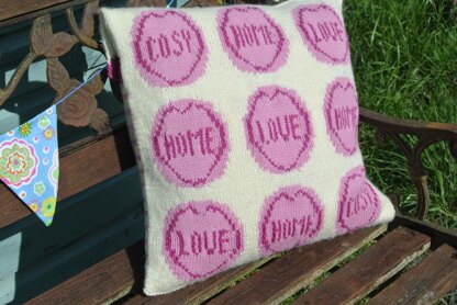 This is a pattern for Love Hearts Cushion Cover, part of the Make at Home range of knits for the home. This is inspired by Love Hearts sweets. The front is intarsia, and the back is stocking stitch stripes. To fit a 40 x 40 cm cushion pad.