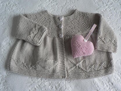 A matinee jacket to welcome a new baby, worked in a soft bamboo Double Knit yarn, using Stocking stitch & Garter stitch and featuring a “Love & Kisses” border.