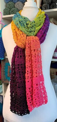 This scarf was created to highlight using one skein of gradient yarn. You can use whatever fine weight cake you have on hand! The sample was created with Yarn Bee Rainbow Wrapsody in Wild & Free colorway.
