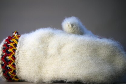 A very close approximation to the traditional Lovikka Mittens from Sweden These mittens are knitted on size 5mm needles, then brushed with a rough brush to create the halo, and finally embroidered with a decorative design on the folded cuffs.