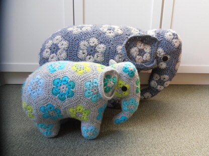 Meterage & sizes: The size of your elephant depends on the yarn you use. To estimate your personal yardage, I advise you to make a flower hexagon, and weigh that after each round. Multiply the amounts by 39 as an estimate of what you will need for the finished elephant. Multiply the amount of the last round by 42 to account for the joining stitches. Use a crochet hook that is one size smaller than your yarn label advises.